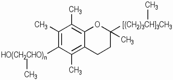 이 원료는 다음의 구조를 갖는 토코페롤의 폴리프로필렌글라이콜에터이고 n은 평균5이다. |