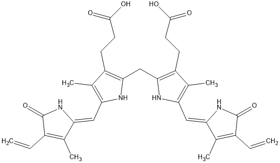 이 원료는 척추동물의 헤모글로빈이 분해되는 과정에서 얻은 적색-오렌지색 대사산물로, 다음의 구조를 갖는다. |