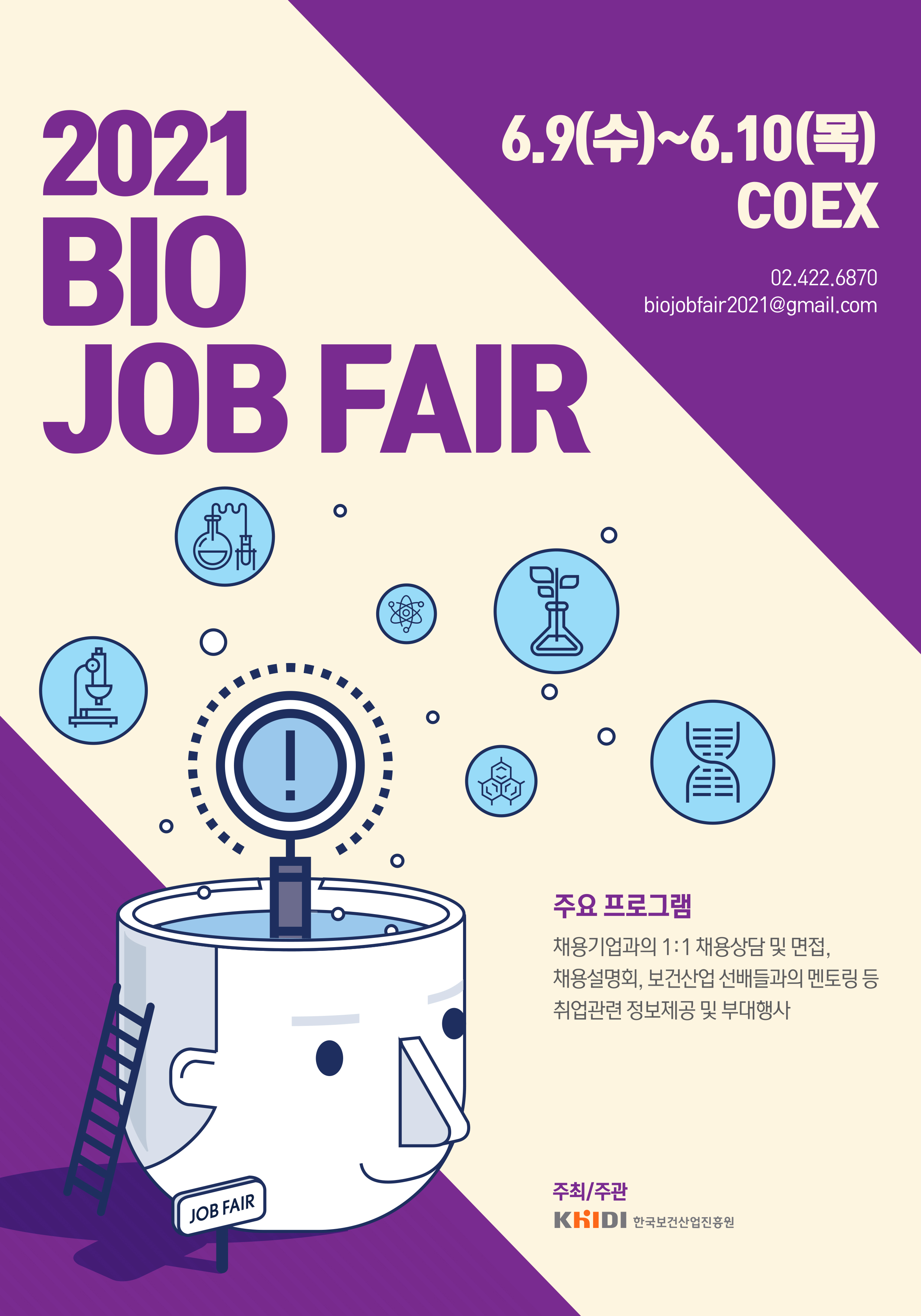한국보건산업진흥원은 보건산업 인재 채용 활성화를 위해 「BIO JOB FAIR 2021」를 21.06.09.(수)~10.(금) 양일간 서울 COEX에서 아래와 같이 개최합니다.