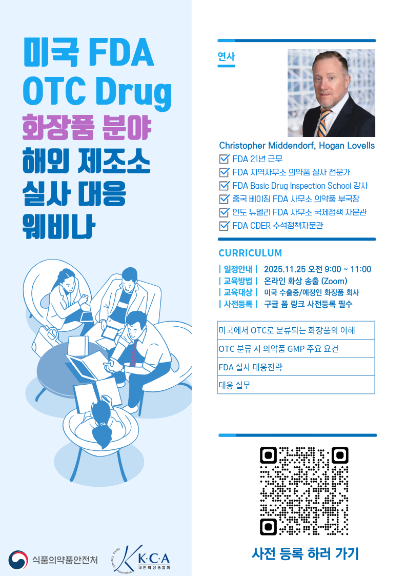 2. 식품의약품안전처 주최, 대한화장품협회 주관으로 『미국 FDA OTC Drug 화장품 분야 해외 제조소 실사 대응 웨비나』를 아래와 같이 개최할 예정이오니, 관심있는 업계 관계자 분들은 2025.11.24.(월) 점심 12시까지 사전등록링크를 통해 신청해 주시기 바랍니다.
