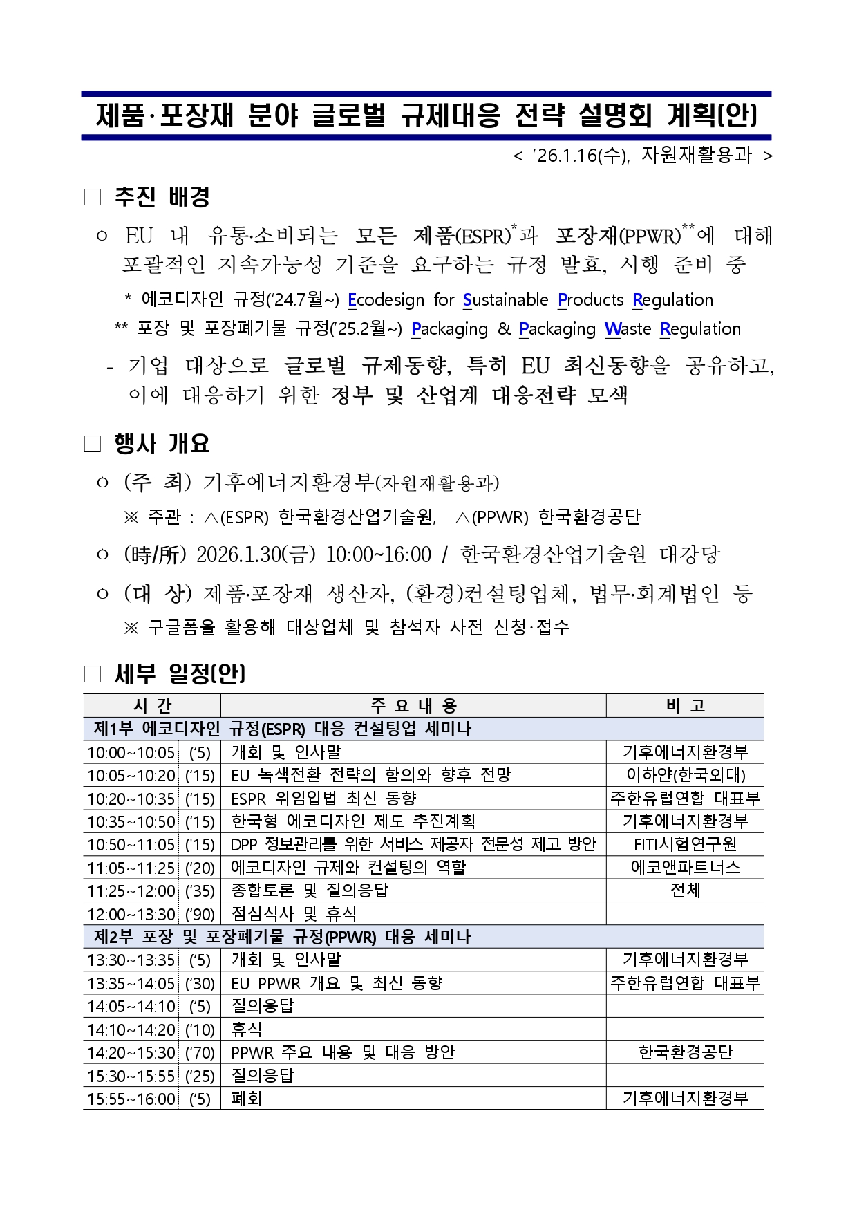 [환경부] 제품・포장재 분야 글로벌 규제대응 전략 설명회 개최 안내