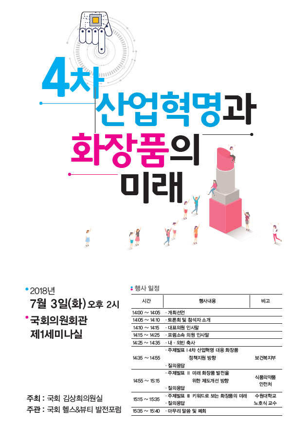 김상희 국회의원실 주최로 한국 건강·뷰티 산업의 지속적인 발전과 글로벌 경쟁력 강화를 위해 입법부, 정부, 학계, 산업계가 함께하는 「4차 산업혁명과 화장품의 미래 국회 토론회」 가 아래와 같이 개최될 예정이오니 많은 참석 부탁드립니다.