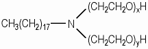이 원료는 다음의 구조를 갖는 스테아릴아민의 폴리에칠렌글라이콜 유도체이다. x+y는 평균 2이다. |