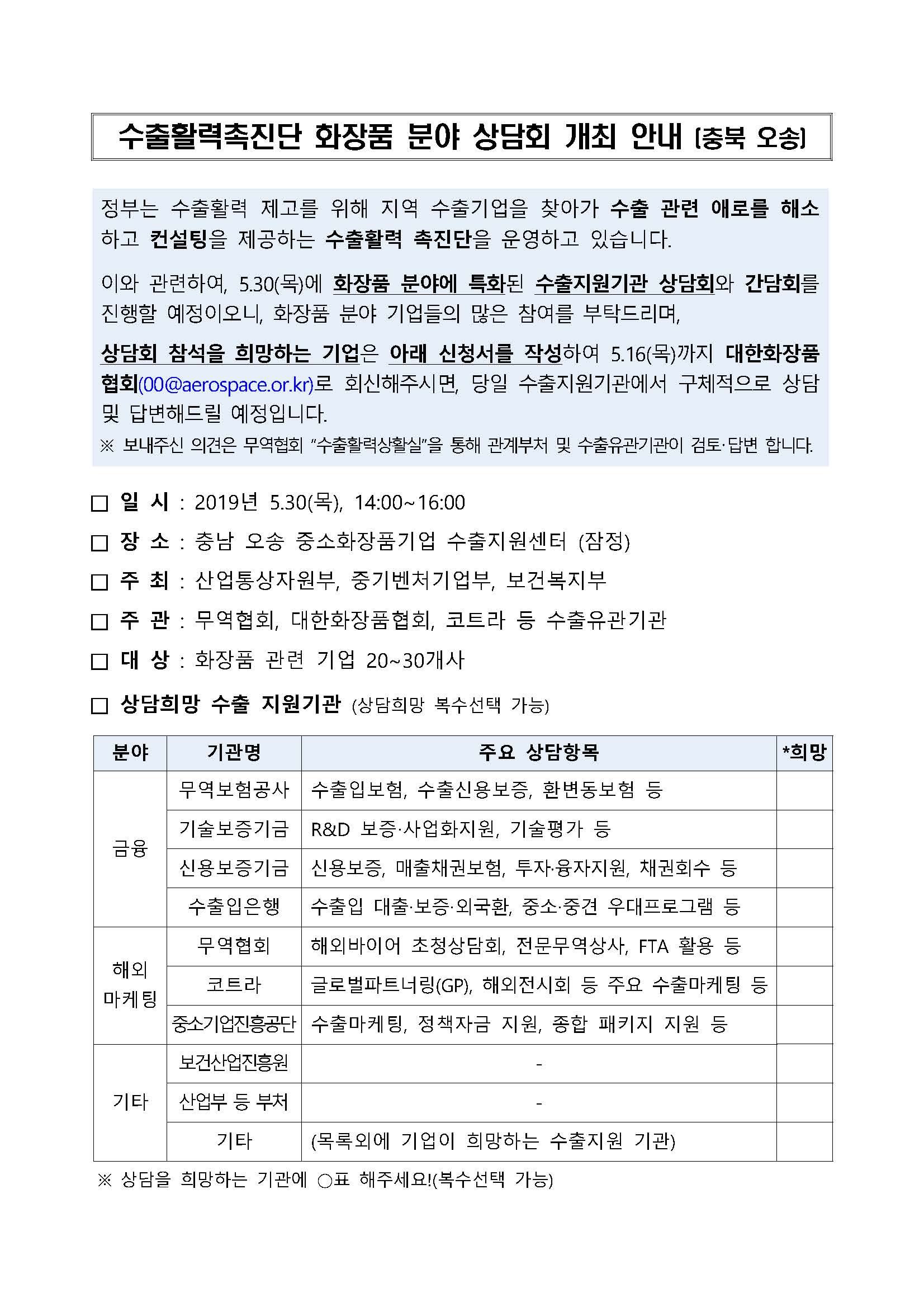 정부에서는5.30(목)에 화장품 분야에 특화된 수출지원기관 상담회(우리협회 공지사항 게시글 참조)를 진행하면서 화장품 제조업자를 대상으로 전문무역상사 또는 국내 유명 파워셀러와의 상담회도 추가적으로 진행하고자 합니다.