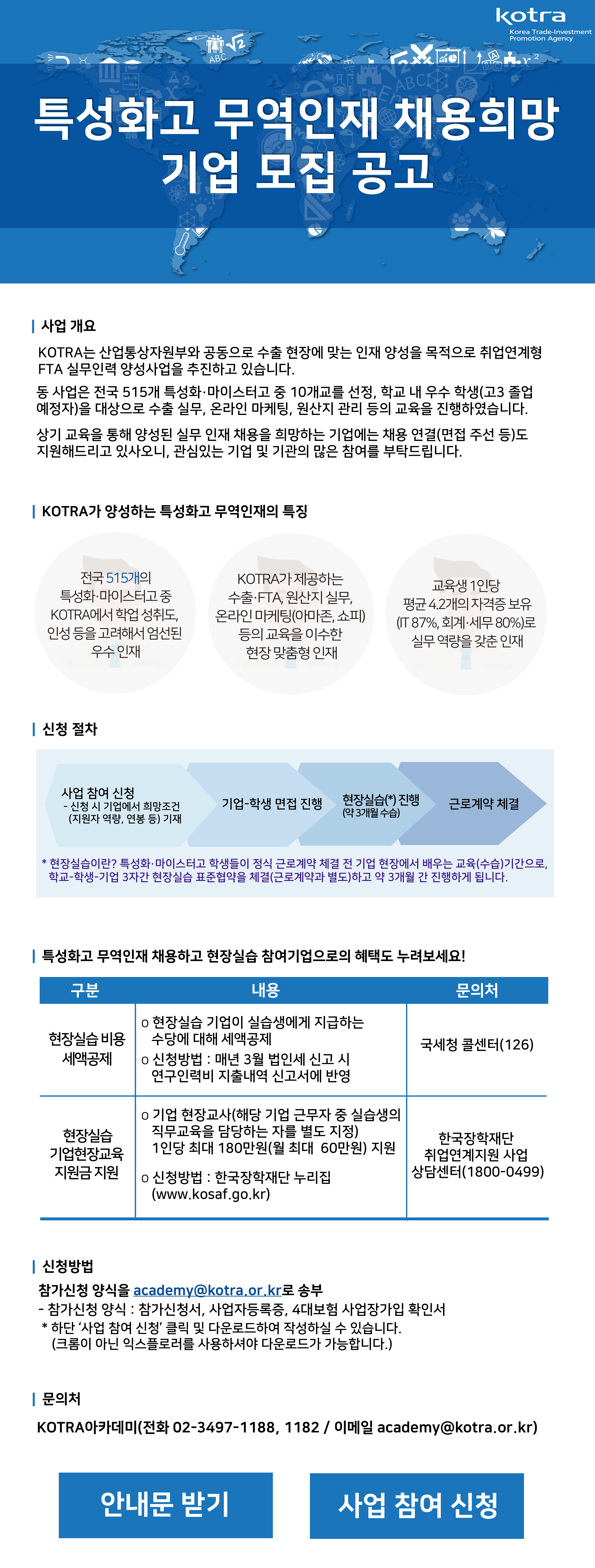 KOTRA 아카데미가 진행하는 수출입 교육을 이수한 학생들을 기업에 채용 연계해주고 있으며, 고졸 인력 채용 시 기업에 주어지는 정부 지원혜택들도 있사오니 관심있는 기업들이 많은 신청있으시기 바랍니다.
