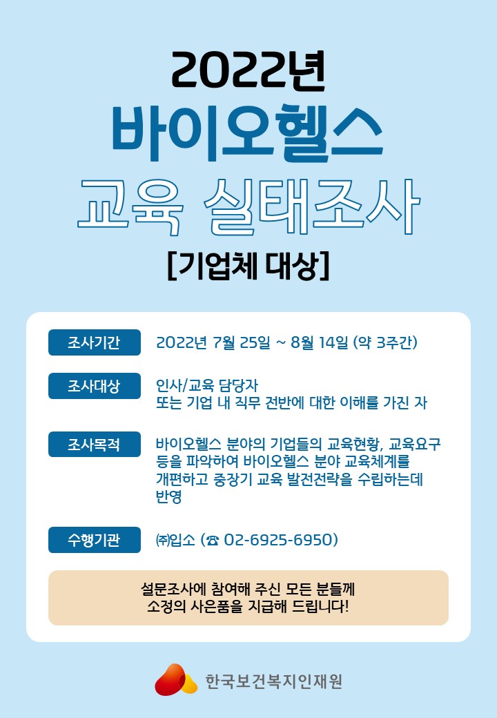 [한국보건복지인재원]'2022년 바이오헬스 교육 실태조사 및 중장기 발전전략 수립' 수행을 위한 설문조사 안내