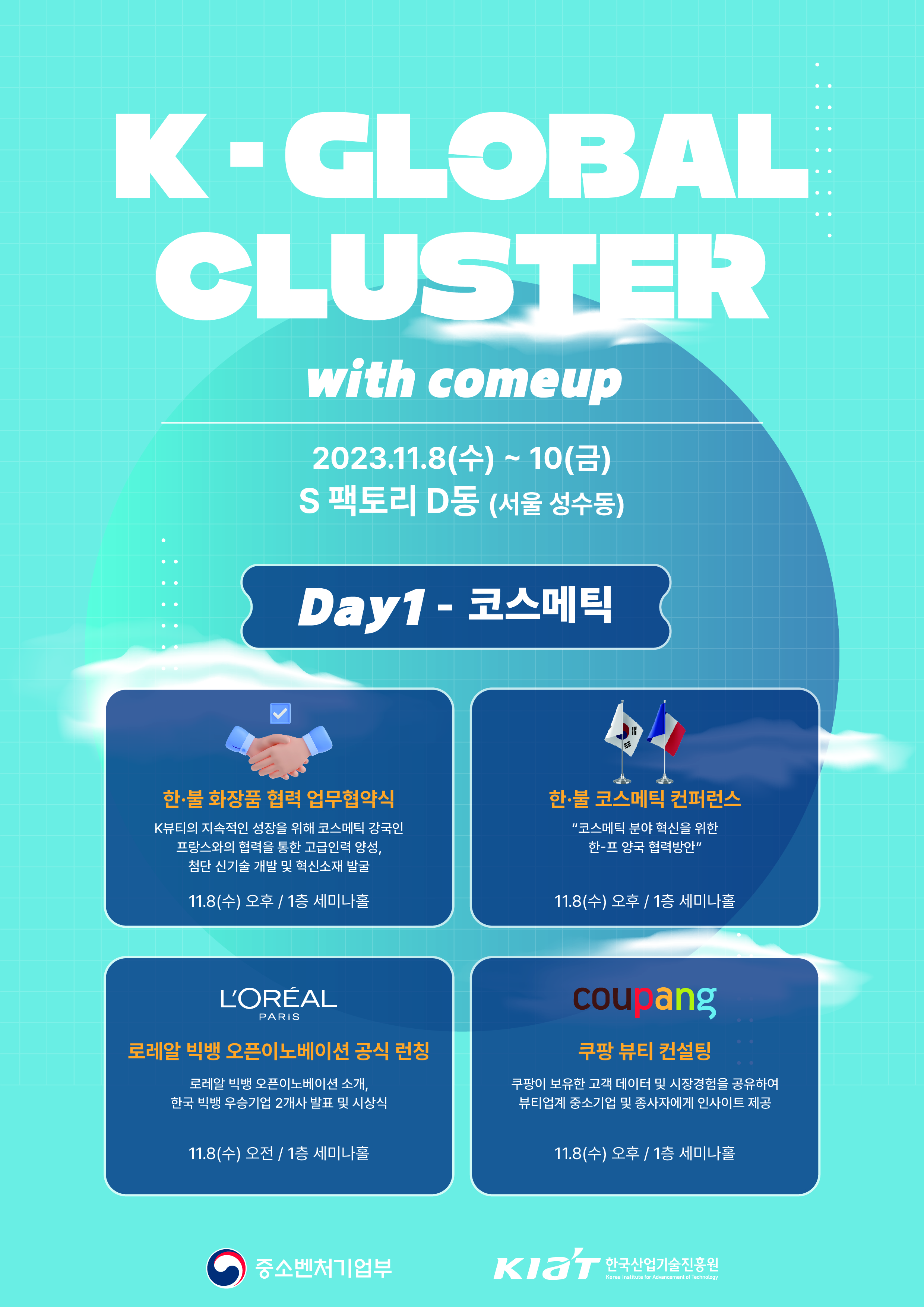 중소벤처기업부와 한국산업기술진흥원에서는 11월 8일 ~ 10일, 3일간 성수동 S팩토리에서 「K Global Cluster : With COMEUP」 를 아래와 같이 개최합니다.