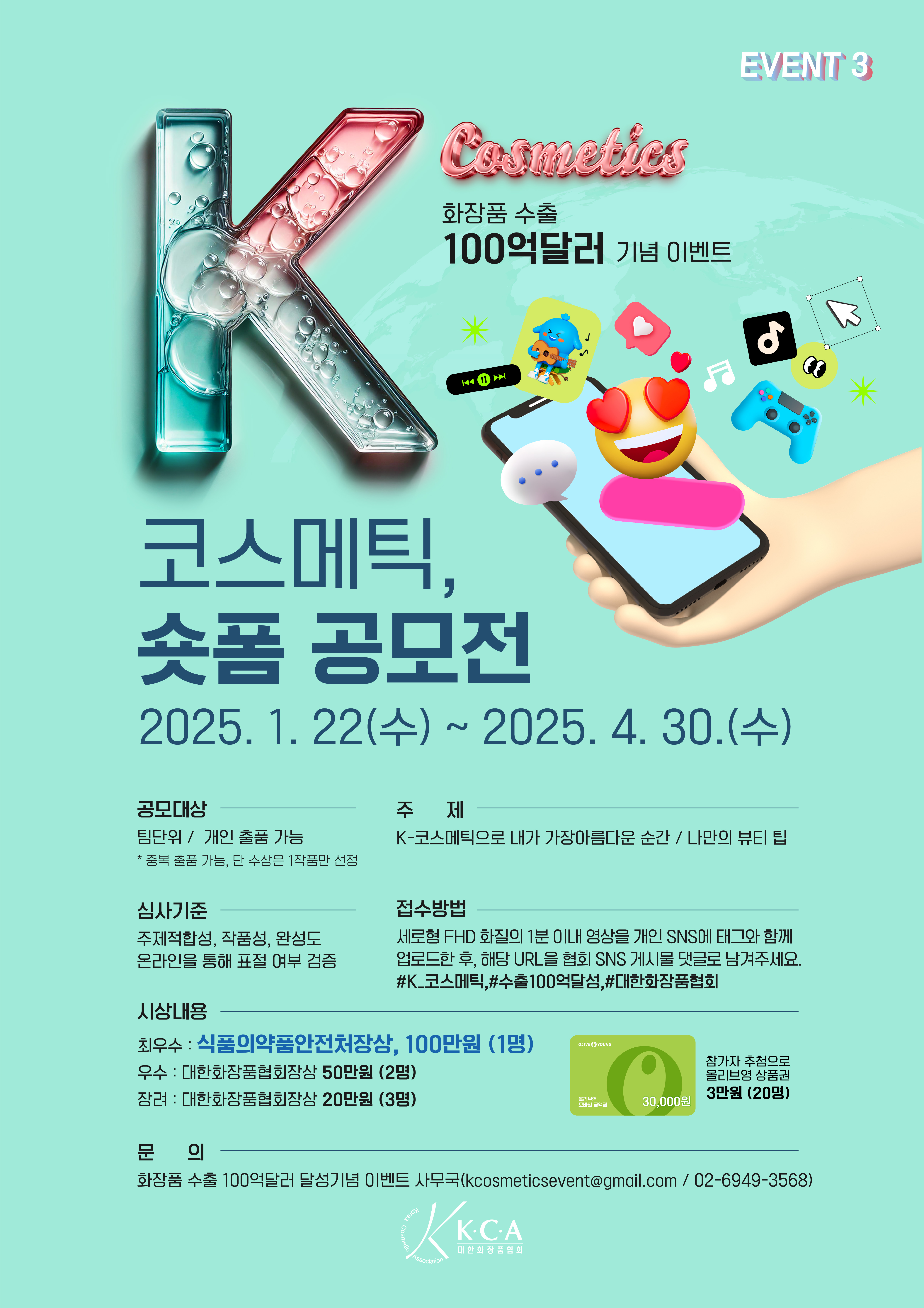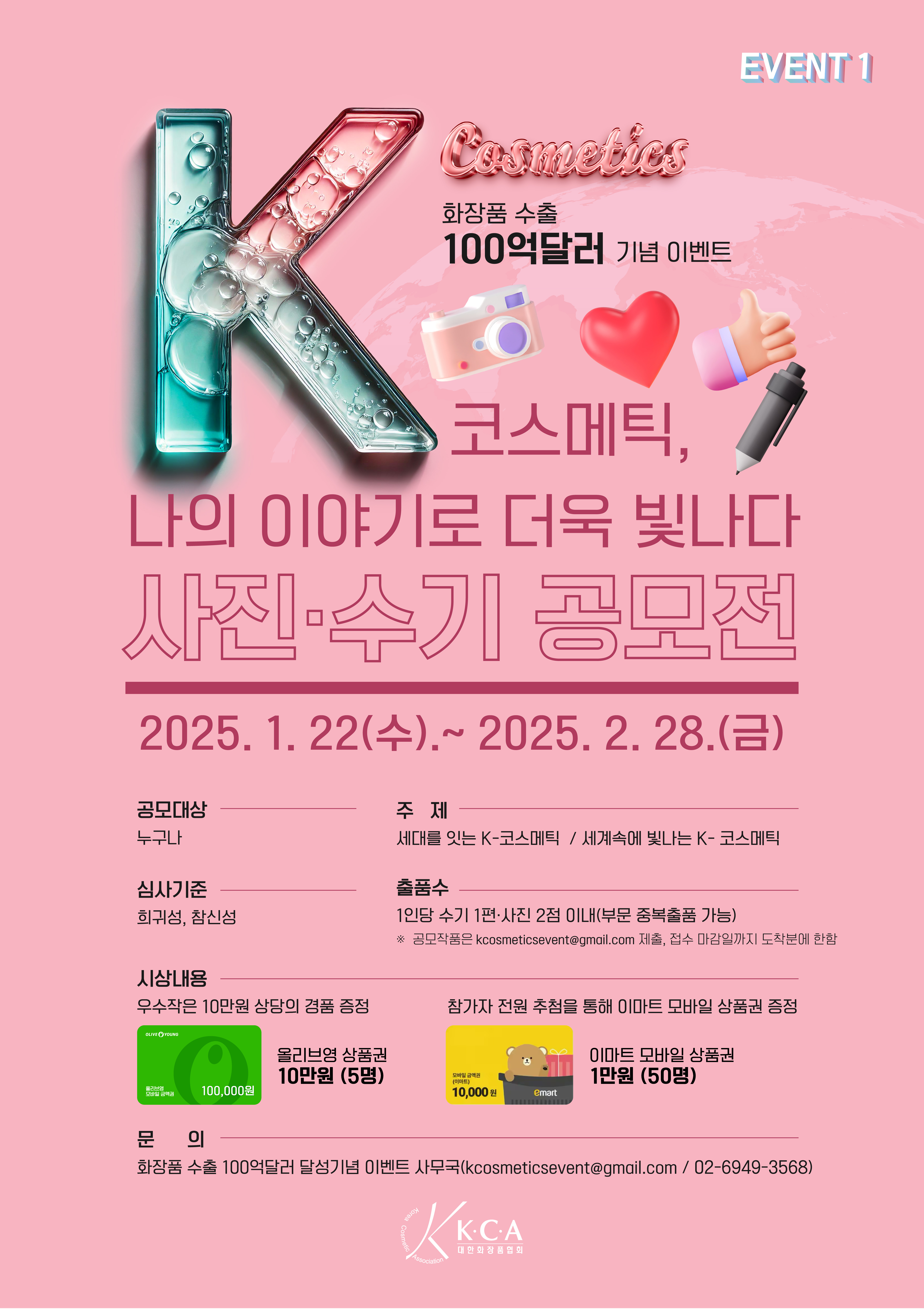 ※ 문의처: 화장품 수출 100억달러 달성 기념 이벤트 사무국(T. 02-6949-3568, E. kcosmeticsevent@gmail.com)