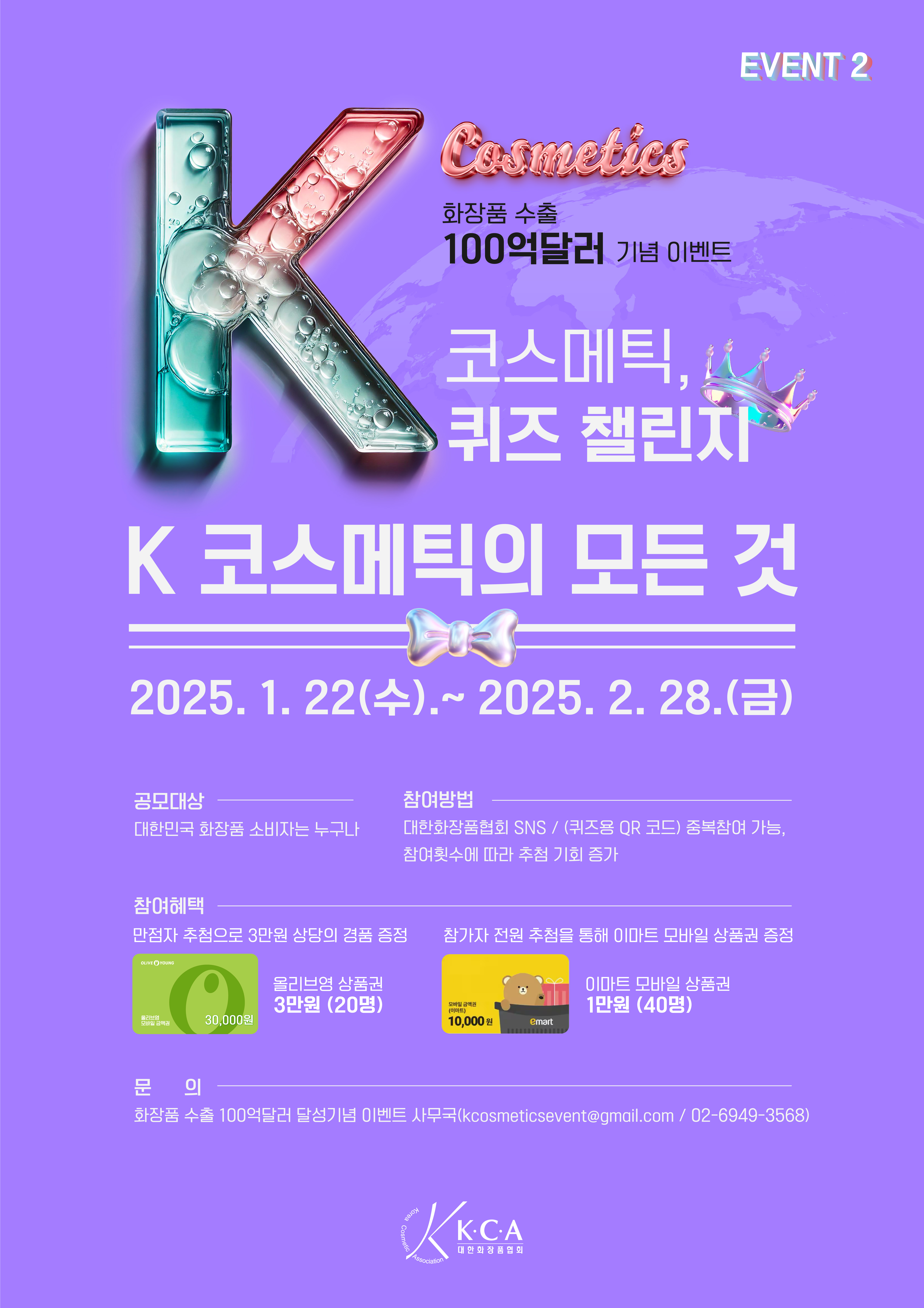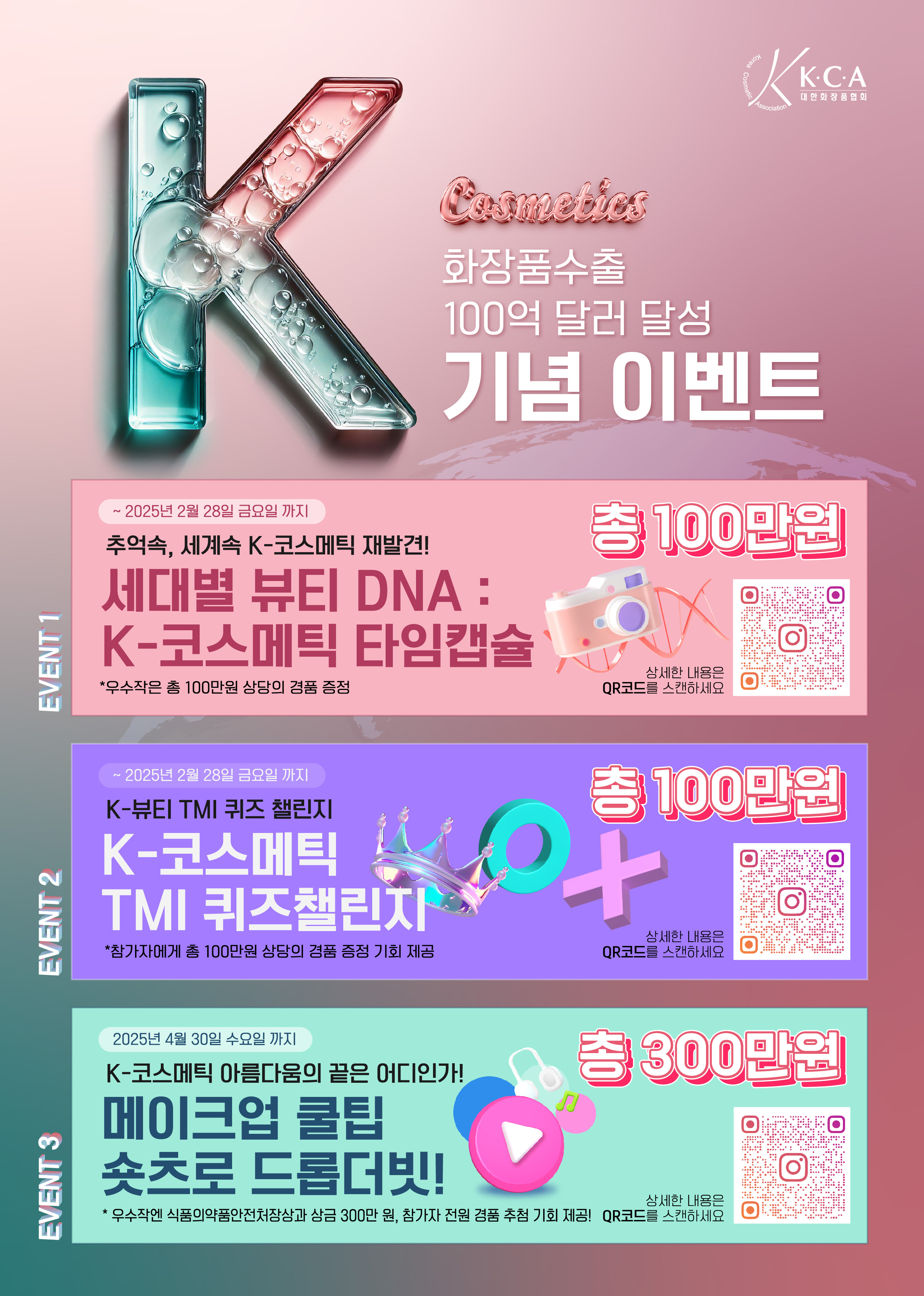 화장품 업계 관계자 및 소비자가 함께 축하하며 새로운 도약을 다짐하고자 '사진.수기 공모전', '퀴즈 챌린지', '숏폼 공모전' 이벤트를 기획하였습니다.