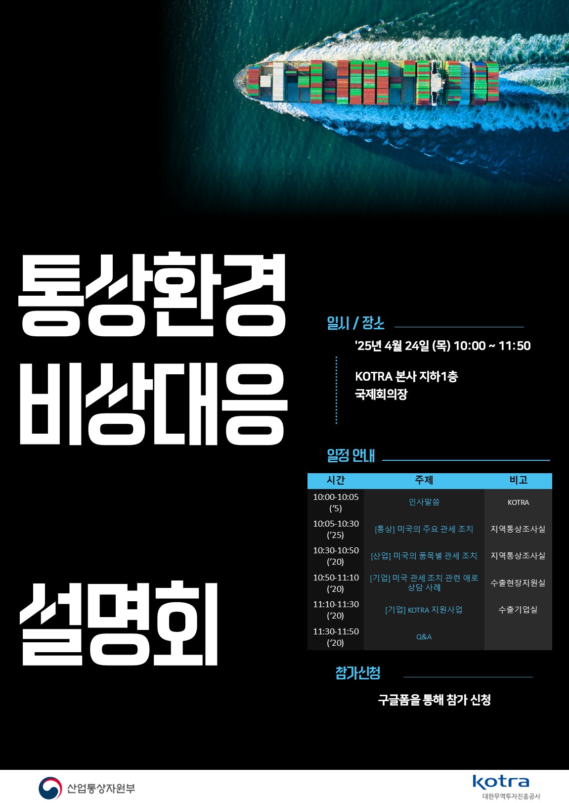KOTRA는 최근 급변하는 통상환경에 효과적으로 대응하기 위해, 아래와 같이 "통상환경 비상대응 정기 설명회"를 개최하고자 합니다.