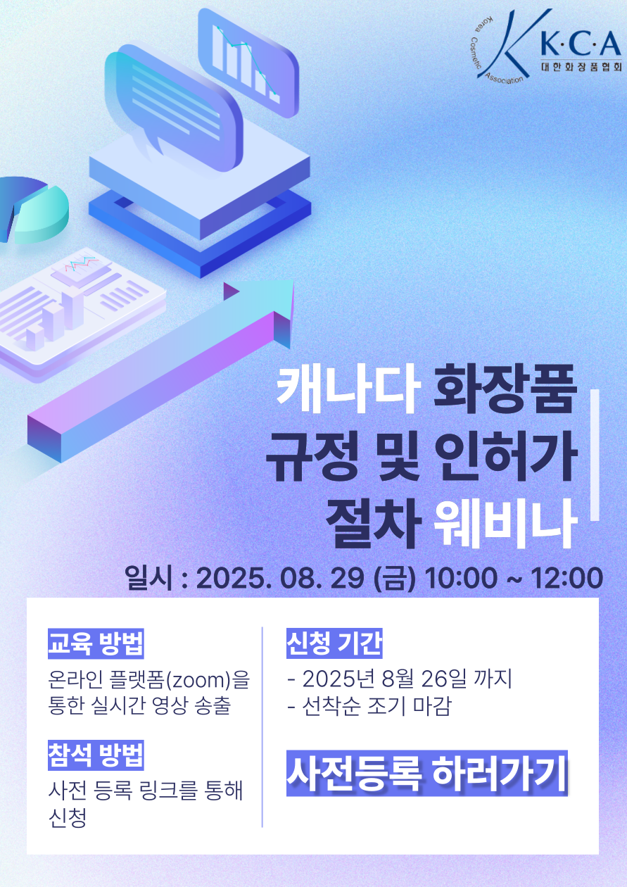 2. 식약처 주최, 대한화장품협회 주관으로 『캐나다 화장품 규정 및 인허가 절차에 대한 웨비나』를 아래와 같이 개최할 예정이오니, 관심있는 업계 관계자 분들은 2025.08.26(화)까지 사전등록링크를 통해 신청하여 주시기 바랍니다.