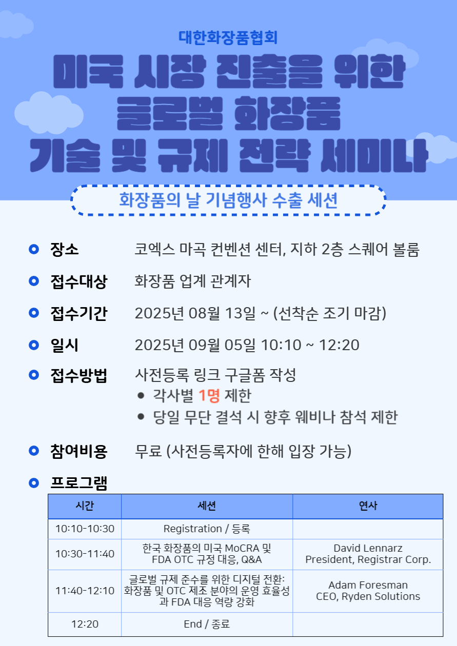 [2025.09.05] 화장품의 날 기념 행사 미국 시장 진출을 위한 글로벌 화장품 기술 및 규제 전략 세미나 개최 안내(마감)