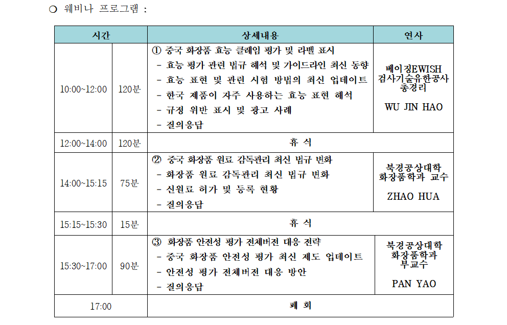 2. 식약처 주최, 대한화장품협회 주관으로『중국 화장품 효능 평가와 라벨 표시, 원료 규제 변화 및 안전성 평가 웨비나』에 대한 무료 웨비나를 아래와 같이 개최할 예정이오니, 관심있는 분들은 사전등록 링크를 통해 신청하여 주시기 바랍니다.