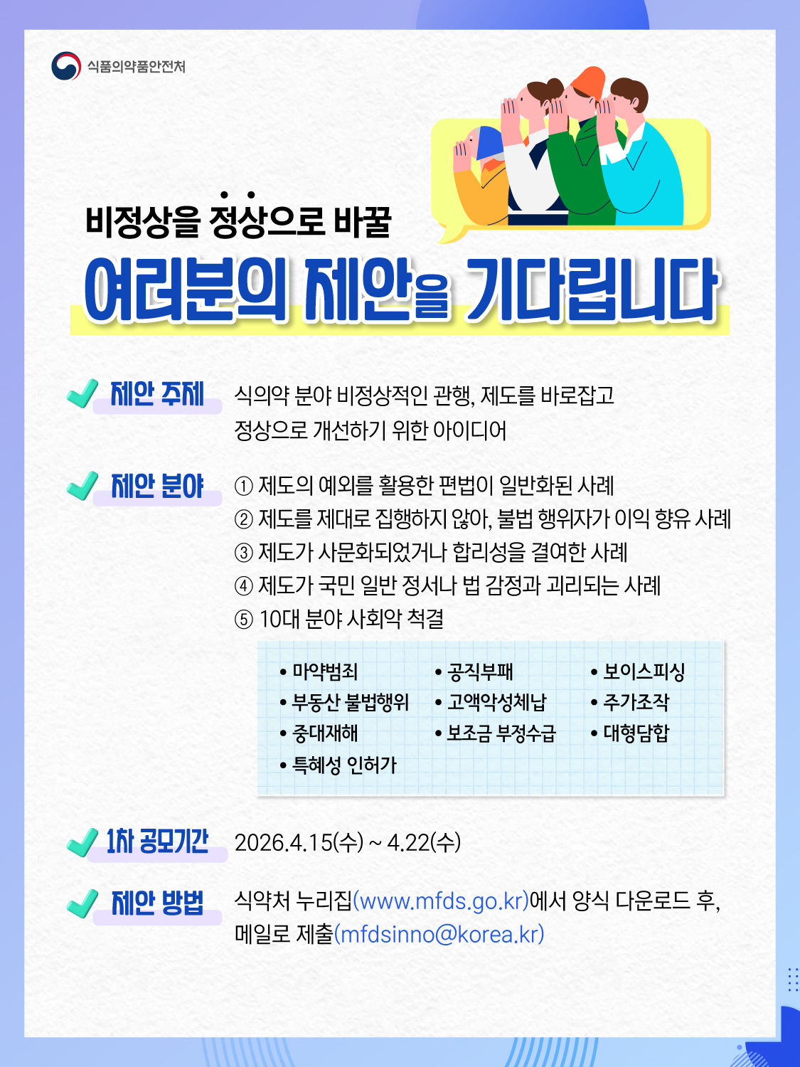 식품의약품안전처, 식의약 분야 정상 개선 아이디어 공모 안내